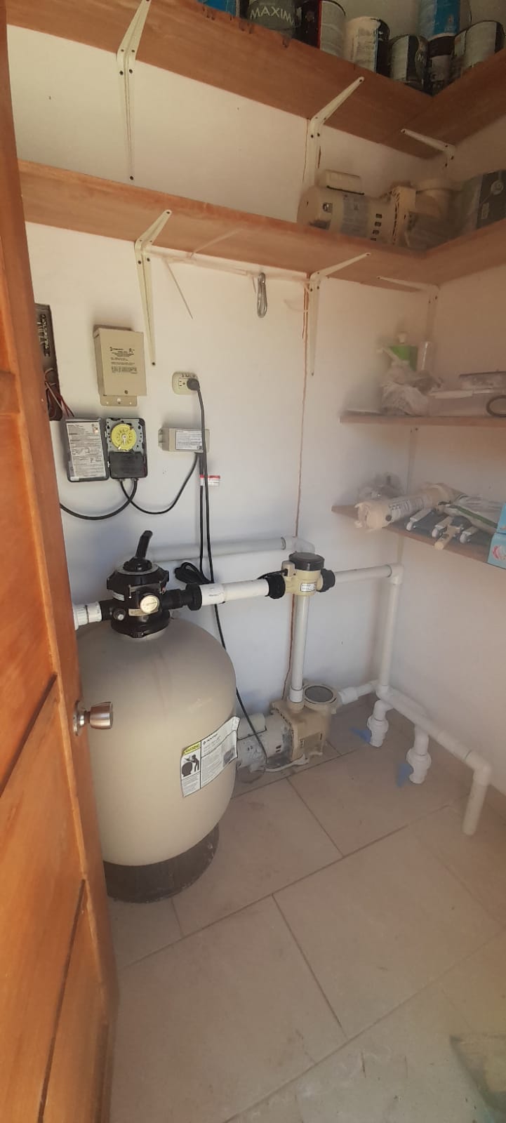 Next to the terrace, a sparkling saltwater pool adds to the luxury. The pool is perfect for cooling off and lounging beside on sunny days. Beyond this, the property features many fruit trees, colorful plants, and walking paths that invite exploration and tranquility. It’s a serene and harmonious escape for anyone seeking peace and connection with the outdoors.