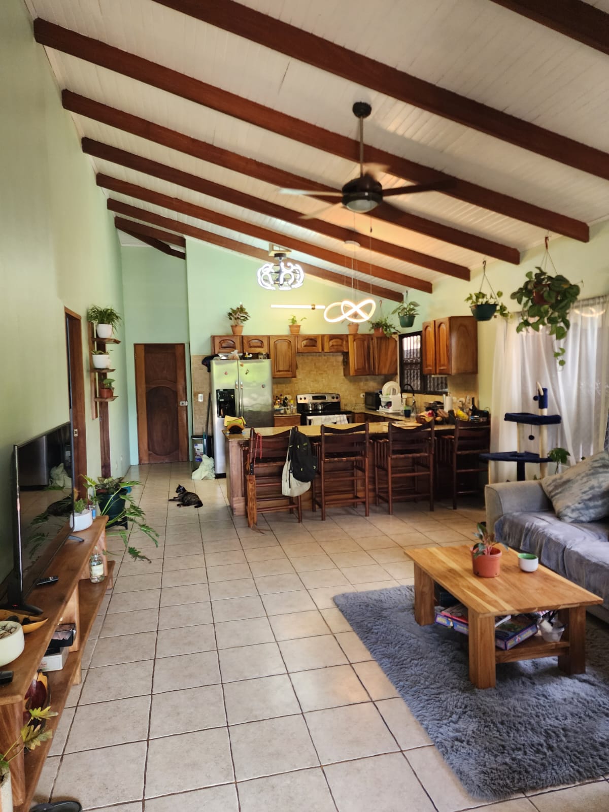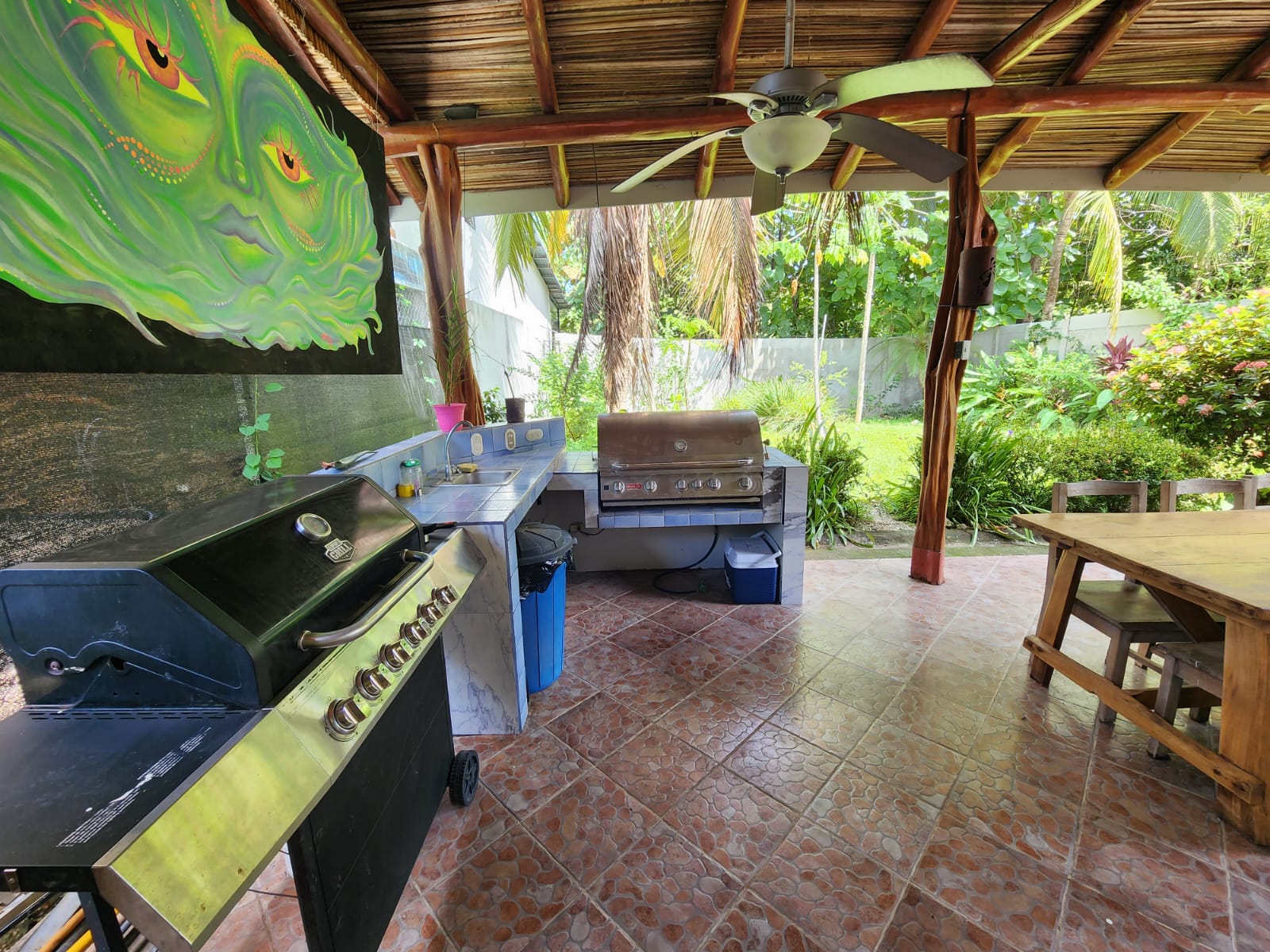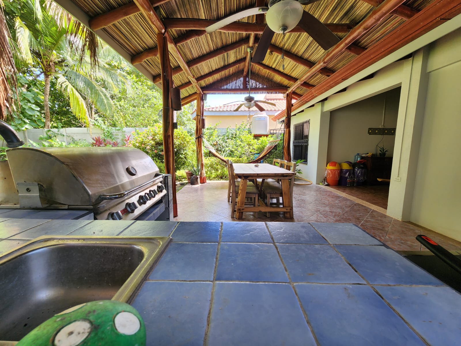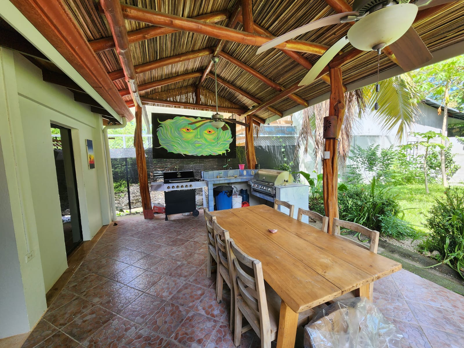 Casa Mariposa is a fully furnished beautiful home located only a short 4-minutes’ drive to Playa Samara, perfect for a full-time resident or as a vacation rental. It has three spacious bedrooms and two bathrooms complete with exotic Costa Rican Guanacaste counters, and granite sinks. All bedrooms have AC and gorgeous hardwood furniture locally handcrafted. The kitchen is totally equipped and has Guanacaste cabinets, granite counter tops, and plenty of storage space. The large open patio with BBQ area offers the perfect place to entertain or for private relaxation. The home is located on a quiet street and has a fully fenced backyard with plenty of garden space.